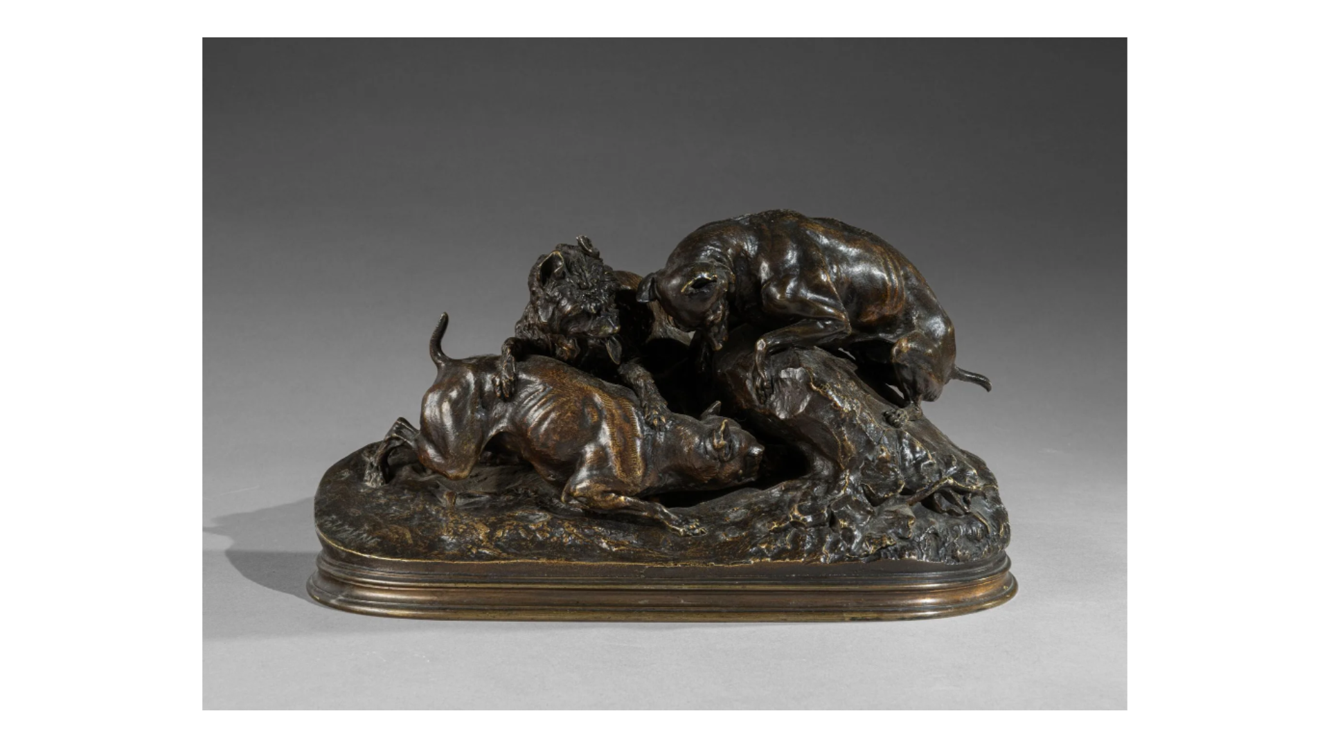 Chiens de chasse couplés Bronze à patine médaille signé sur la terrasse, fonte ancienne 12×15 cm
