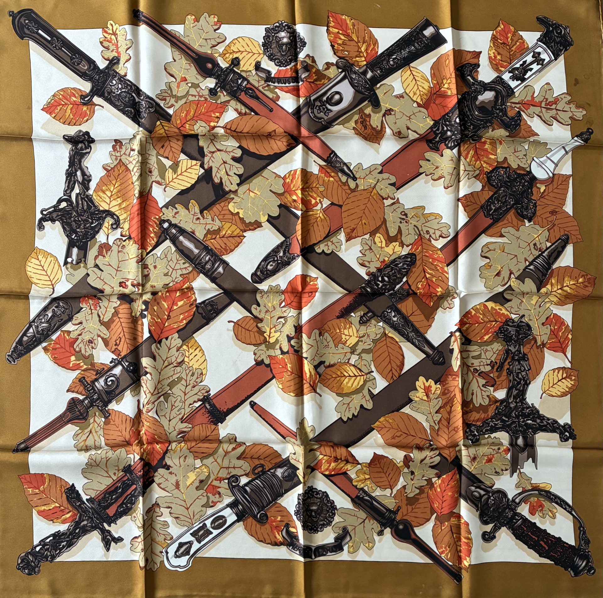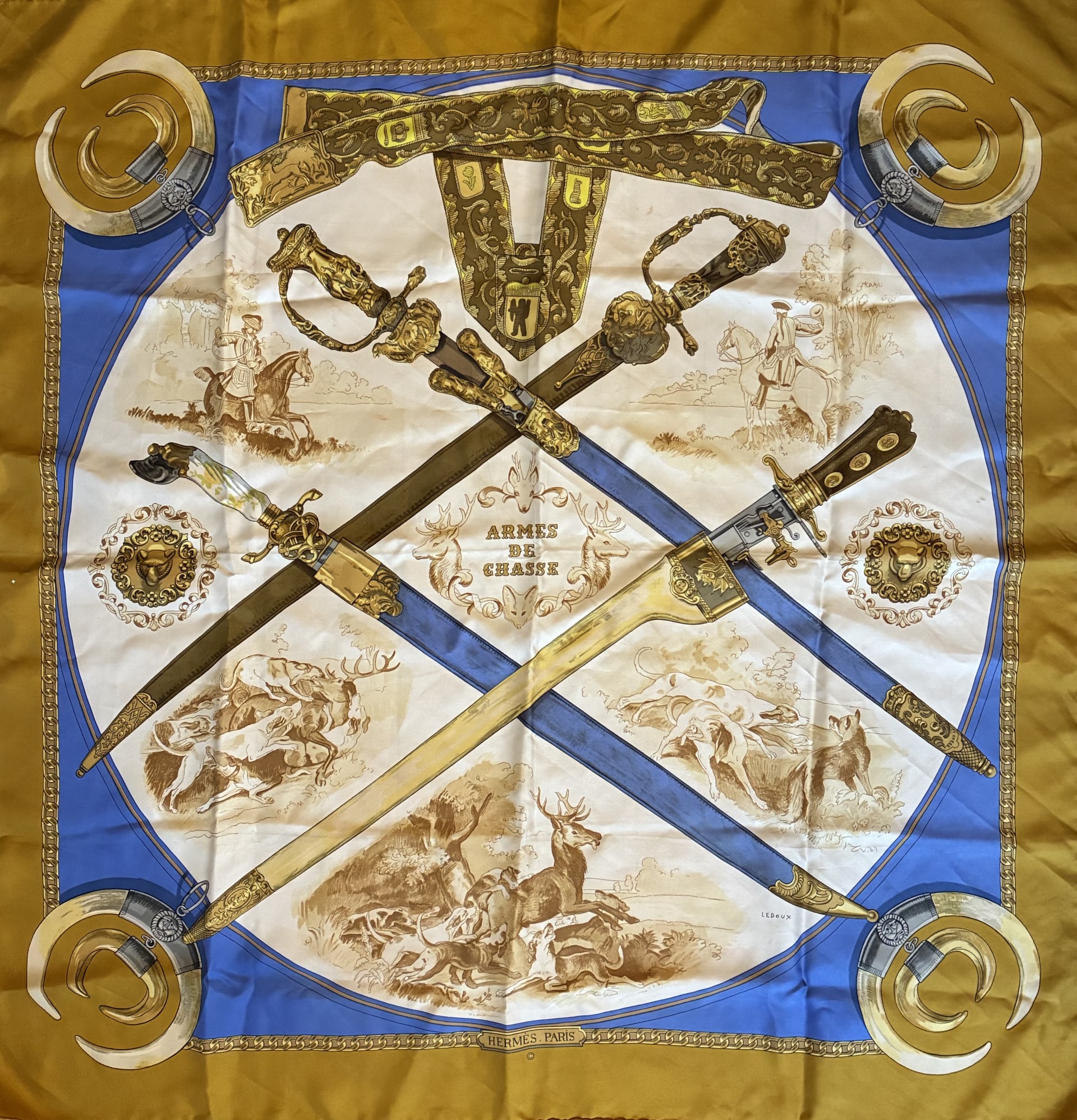 Armes de chasse Par Philippe Ledoux (1903-?) Sur fond crème, bordure jaune, titré au centre, signé en bas à droite, estampillé en bas au centre, édité en 1981 90×90 cm